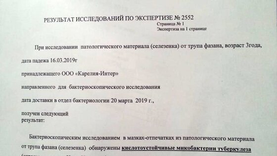 Фото из группы "Экопарк Зоолесье" У одной из птиц зоопарка «Зоолесье» в Петрозаводске на территории ТРЦ «Лотос-Plaza» обнаружен туберкулез. Как стало известно порталу «Карелия.Ньюс», в «Республиканскую ветеринарную лабораторию» 20 марта был доставлен труп трехлетнего фазана, который проживал в зоопарке «Зоолесье». После проверки поступившего материала лабораторией был выявлен туберкулез. В распоряжении портала «Карелия.Ньюс» оказался результат анализа. Директор лаборатории Сергей Равусов подтвердил нашему порталу, что такой факт действительно выявлен, однако отказался комментировать информацию, сославшись на то, что этим случаем занимается ветеринарная станция, куда и следует звонить. Нам удалось дозвониться и до этого ведомства. Заместитель директора станции Дмитрий Михайлов категорически заявил, что на вопрос о мертвом фазане может ответить только директор станции Оксана Зайцева, которая появится только в понедельник. В Минприроды и экологии Карелии нашему порталу также подтвердили, что факт выявления болезни в зоопарке зафиксирован, но попросили дать время до вторника, чтобы подготовить конкретный ответ на вопрос о действиях в этой ситуации. Нам, к сожалению, не удалось дозвониться до директора ООО «Карелия-Интер» Василия Попова. Именно ему принадлежит «Зоолесье», а также зоокомплекс «Три медведя» в Сямозере. На звонки Василий Борисович не отвечал. Мы позвонили в сам зоопарк в Петрозаводске, где нам неохотно подтвердили, что действительно случай гибели фазана у них зафиксирован. Тем не менее, в настоящий момент зоопарк продолжает работать. Однако остальных птиц от посетителей изолировали, сообщили в «Зоолесье». Там также добавили, что из птиц погиб только этот фазан. Добавим, что туберкулез очень опасное вирусное заболевание, которое может передаваться от вида к виду. Иными словами, больная птица может заразить как животное, так и человека. Инфицирование человека от птицы может произойти через перо, воду или мясо.