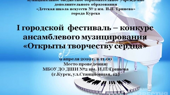 9 апреля 2019 г. в МБОУ ДО ДШИ № 2 им. И.П. Гринева г. Курска (ул. Станционная, 12) в 11.00 состоится открытие I городского фестиваля-конкурса ансамблевого музицирования «Открыты творчеству сердца». В конкурсе примут участие более 100 обучающихся Детских школ искусств г. Курска в возрасте от 7 до 17 лет включительно. Конкурсные выступления пройдут в двух номинациях: «Фортепианный ансамбль» и «Камерный ансамбль». В состав жюри фестиваля-конкурса входят: Локощенко Светлана Владимировна – Почетный работник среднего профессионального образования России, председатель предметно-цикловой комиссии концертмейстерского класса и камерного ансамбля Курского музыкального колледжа им. Г.В. Свиридова, Крешкова Татьяна Григорьевна – артист оркестра Курской областной государственной филармонии, преподаватель предметно-цикловой комиссии оркестровых струнных инструментов Курского музыкального колледжа им. Г.В. Свиридова. Возглавит жюри доцент кафедры специального фортепиано Воронежского государственного института искусств, кандидат искусствоведения, артист ансамбля Воронежской государственной филармонии Калашникова Ольга Алексеевна.