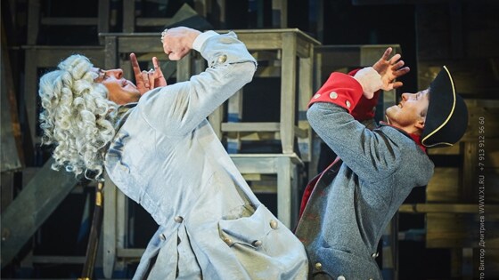 Власть уже есть и стоит вроде бы прочно, и как боятся ее! И европейские ценности уже вроде привнесены в Россию. Только вот ценности эти — все больше пошлейшая шутовская команда с идиотскими шутками. Самая верхушка огромной империи — а словно одна шутовская команда. И носится по сцене балаган, не разобрать, кто там шут, а кто принц Голштинский…. Да и обер-прокурор (Константин Телегин) вместе с вице-канцлером (Владимир Лемешонок) тоже недалеко от шутовской команды ушли. Правда, иначе — они словно надели застывшие маски из итальянской комедии дель-арте. Но маски – явление иноземное, они лишь чуток прикрывают суть придворных — жадную, властолюбивую, неуемную… И понимаешь, отчего царь Петр (Андрей Черных) так ценит и прощает все своему любимцу Меншикову (Павел Поляков). Тот хоть в европейском парике, хоть без парика, хоть в треуголке — живой, настоящий. Вор, подлец, взяточник, но — живой, реальный, без масок… Верховная власть – царь Петр. Немолодой, одинокий, усталый человек, у которого из близких людей — лишь ворюга Меншиков, гулящая, падкая на лесть и ухаживания бонвиванов жена ( Ирина Кривонос) и случайно попавшийся под руку мальчишка-шут… Солдат Иван Балакирев (Сергей Богомолов), чудом попавший в эту властную круговерть, живой и настоящий. Его наивная искренность, которая порой сродни глупости, выбивает героя из окружающего шутовского хоровода, вытаскивает наверх… Только вот рядом с власть имущими подняться наверх – это не всегда на вершину, порою – на табуретку, поближе к веревке…