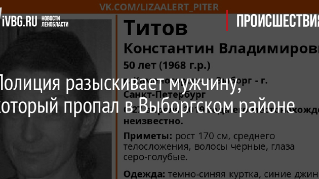 Сотрудники полиции разыскивают мужчины 1968 года рождения, который пропал в Выборгском районе. О его местонахождении ничего неизвестно с 27 апреля 2019 года. Информация об этом появилась в сообществе "Поисковый отряд "Лиза Алерт" Питер" в социальной сети "ВКонтакте". Титов Константин Владимирович 1968 года рождения пропал в районе Каменногорска, Выборга и Петербурга. Точное местонахождение мужчины неизвестно с 27 апреля 2019 года. Рост пропавшего 170 см, среднего телосложения. Волосы черные, глаза серо-голубые. Был одет темно-синюю куртку, синие джинсы и резиновые тапки. При себе имел черную сумку. ВыборгВсех кто увидит Константина Владимировича, просят позвонить по телефону 8 (800) 700-54-52 или 112.