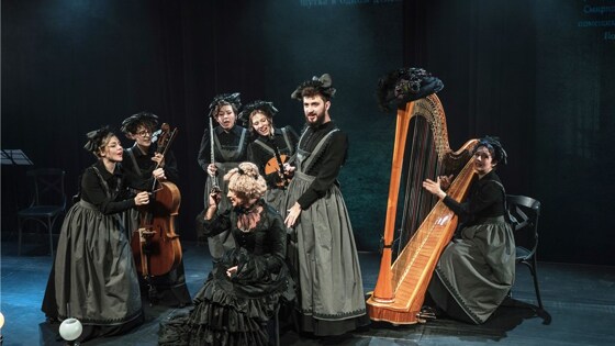 Увы, хозяйка дома — помещица Попова, вдовушка с ямочками на щеках, судя по всему, давно не подходит к любимому музыкальному инструменту, потому что безмерно скорбит по умершему семь месяцев назад супругу. Лишь изредка очаровательная Елена Ивановна позволяет себе вспомнить любимый трогательный романс и с грустью спеть его под аккомпанемент своих прелестных и таких же печальных как их хозяйка служанок. С романса и начинается спектакль "Медведь", поставленный Владимиром Панковым в Центре драматургии и режиссуры специально для Международного чеховского фестиваля по мотивам пьесы-шутки А.П. Чехова. Театральные сочинения В. Панкова невозможно отнести к какому-либо жанру или направлению, ибо их причудливая, порой парадоксальная гармония не поддается поверке алгеброй. Опытный зритель, привыкнув к его странной "лире", уже не задает себе недоуменные вопросы, а каждый раз с наслаждением проваливается со всеми потрохами в омут его диковинных трагикомических "синтетических" зрелищ, рожденных безудержной режиссерской фантазией. Так произошло и на этот раз. Поборник "правды жизни" в театре, скорее всего, возмутится тем, что в спектакле, о котором идет речь, множество странностей и причуд. Например, Елена Ивановна Попова вместо фотографий любимого мужа со слезами рассматривает и гладит портреты А.П. Чехова и В. И. Немировича-Данченко, не переставая при этом корить усопшего Николая Михайловича за невнимание и измены! Служанки Елены Ивановны, похожие на каких-то таинственных ведуний, с тусклыми фонарями в руках бесшумно появляются из недр загадочного дома и рядком рассаживаются у своих пюпитров. Инфернальную компанию дополняет одетый, как и ведуньи, в черную кофту и серый сарафан и украшенный траурным, но изысканным бантом-шляпкой в кудрявых волосах лакей Лука — бородатый старик лет 24-25 от роду с редким музыкальным инструментом — бас-кларнетом — в руках. Фото: Олеся Хороших Есть здесь и весьма колоритная пара: сказочно красивая девушка в белоснежном платье и обладающий громоподобным басом мощный импозантный мужчина в черной тройке, пальто и шляпе. Как станет ясно чуть позже, это — alter-ego главных героев. Последние, периодически спускаясь в зрительный зал, будут с волнением наблюдать за этими фантомами — то ли вспоминая "дни золотые", то ли грезя наяву. И возникнет нечто, напоминающее театр в театре, когда ты перестанешь отличать вымысел от реальности. И вспомнишь Константина Гавриловича Треплева с его творческим постулатом: "Надо изображать жизнь не такою, как она есть, и не такою, как должна быть, а такою, как она представляется в мечтах". Однако лирические отступления не помешают развитию известных каждому читающему человеку событий: в дом, несмотря на чуточку наигранную ажитацию Поповой и противодействие кларнетиста Луки, войдет благопристойный господин в соболиной шубе — нестарый помещик Григорий Степанович Смирнов, внешне подозрительно напоминающий все того же В. И. Немировича-Данченко. И, объяснив свое затруднительное финансовое положение, попросит хозяйку возвратить ему долг её покойного мужа в размере 1200 рублей. Она деликатно откажет, но потом, возмущенная грубостью, даже прогонит его. Но он не уйдет. Начнется словесная перепалка, перерастающая в непримиримый конфликт. А через некоторое время лихой ямщик натянет поводья, взмах