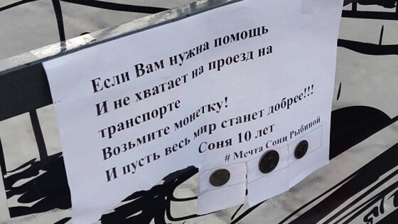 В российских городах, от Москвы до Когалыма, запустили акцию #МечтаСониРыбиной — в память 10-летней петербурженки, скончавшейся от рака в январе этого года. На остановках общественного транспорта начали появляться объявления с прикрепленными монетками, которыми могут воспользоваться те, кому не хватает на проезд. Подобные объявления были мечтой 10-летней Сони Рыбиной. «Что, если сделать так, чтобы на каждой остановке были листы с объявлениями, но вместо номеров отрывных телефонов висели рубли — на тот случай, если людям не хватает на проезд. Тогда они могли бы отрывать монетку и доезжать до дома», — приводит фонд «Надежда — детям» слова девочки. В январе Соня скончалась после продолжительной борьбы с раком. Еще осенью 2018 года о мечте девочки размещать объявления с монетками на остановках городского транспорта рассказали в социальных сетях, а уже в марте 2019-го запустили флешмоб #МечтаСониРыбиной. Сейчас к акции присоединились жители 49 городов России, Казахстана и Украины. Посмотреть эту публикацию в Instagram #мечтаСониРыбиной «Что если сделать так, чтобы на каждой остановке были листы с объявлениями, но вместо номеров отрывных телефонов висели бы рубли — 2, 5, 10, на тот случай, если людям не хватает на проезд, тогда они могли бы отрывать монетку и доезжать до дома». — говорила девочка Соня Рыбина, которая умерла в январе от рака. Её идею поддержали и сделали вот такие необычные объявления. Флешмоб распространился по всей стране. Поддерживаю и я. Объявления уже готовы, скоро расклеим. Пожалуйста, не срывайте, если увидите! Публикация от Наталья Сулакшина / МИРЕЙКА (@nataliasulakshina) 11 Июл 2019 в 10:57 PDT Посмотреть эту публикацию в Instagram Жители города Лесосибирска в Красноярском крае присоединились к флешмобу #МечтаСониРыбиной. Десятилетняя Соня Рыбина скончалась от онкологии 30 января. Сотрудники питерского проекта «Надежда детям», знавшие девочку, решили не смотря ни на что исполнить ее мечту: монетки вместо объявлений на остановках, чтобы тот, кому не хватает на проезд, всегда мог доехать до дома. Ребята развесили объявления по Санкт-Петербургу, и рассказали о мечте Сони в соцсетях... К этому моменту к акции присоединились 49 городов России, Украины и Казахстана Фото: ЧП Лесосибирск/VK Публикация от Сибирь. МБХ медиа | Новости (@sibmbk) 9 Июл 2019 в 5:34 PDT Посмотреть эту публикацию в Instagram Сегодня вечером я увидела на остановке это объявление и подумала, что это какая-то игра. Придя домой полезла в интернет. Милой девочки Сони, которая придумала расклеивать объявления с монетками, больше нет, она умерла от рака. Теперь такие объявления в память о Соне расклеивают другие люди. #мечтаСониРыбиной #мытищи Публикация от Nᴀᴛᴀʟɪᴇ K. (@chernika_instablog) 19 Июн 2019 в 1:48 PDT Посмотреть эту публикацию в Instagram #мечтасонирыбиной #всемдобра #всемдобра🙏 #всемдобра❤️ #всемдобра✌ #всемдобра🙌 #всемдобра✌️ #всемдобра🙏💕 #всемдобра😘 #позитив #позитивчик #мирпозитива #мирпозитива🤗 Публикация от light_side_in_life (@light_side_in_life) 13 Июн 2019 в 11:09 PDT Посмотреть эту публикацию в Instagram Из любого правила найдутся исключения. Сегодня на одной из остановок встретилось объявление, которое мы снимать не стали. Потому что это не просто объявление, а своеобразный способ помощи нуждающимся. И ещё немаловажный момент — оно приклеено на скотч, а не на клей, как у вандалов, готовых испортить любую поверхность рад