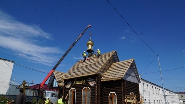 Новые золотые купола и накупольные кресты появились на храме исправительной колонии №9 УФСИН России по Курской области. Протоиерей Евгений Бычков и помощник начальника УФСИН по организации работы с верующими протоиерей Александр Зинченко освятили их перед возведением. - Купола обшиты специальным металлом, устойчивым к любым погодным условиям. Он сохранит яркий золотистый вид на долгие годы, - рассказали в пресс-службе УФСИН РФ по Курской области. В храме Анастасии Узорешительницы регулярно проводятся богослужения, которые посещают более 80 осужденных. Все работы по ремонту в храме проводят осужденные, средства на реставрацию, изготовление куполов и иконостаса жертвовали меценаты, сами осужденные, а также сотрудники пенитенциарного учреждения.