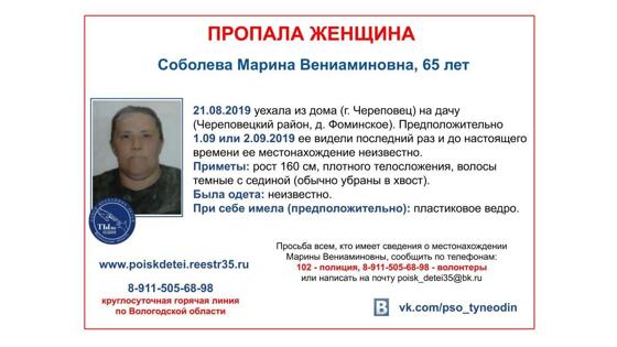 Известно, что 65-летняя Марина Вениаминовна Соболева еще 21 августа уехала из дома на свою дачу, расположенную в деревне Фоминское Череповецкого района. До настоящего времени ее местонахождение неизвестно. Предположительно 1 или 2 сентября ее видели в последний раз. Приметы: рост 160 см, телосложение плотное, волосы темные с сединой (обычно убраны в хвост). При себе пожилая череповчанка предположительно имела пластиковое ведро. Граждан, кто располагает информацией о ее местонахождении, просят позвонить в полицию по телефону «102», либо волонтерам Поисково-спасательных отрядов «Ты не один» (8-911-505-68-98) или «Азимут» (8-911-518-33-66).