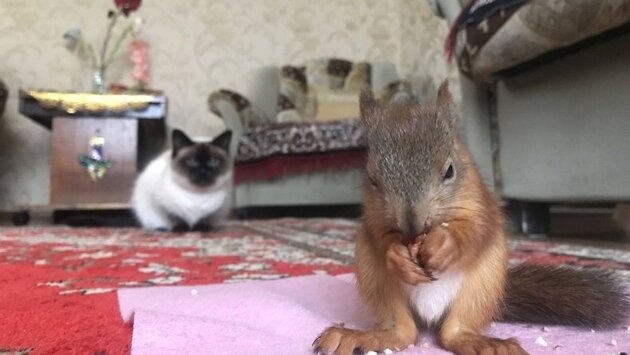 28-летний житель села Кончезеро Игорь Гришин знать не знал, собираясь в лес по грибы, что вернется оттуда с необычным трофеем. - В лесу неожиданно ко мне на ногу заполз бельчонок, совсем крошечный, видно было, что ему тяжело передвигаться. Я поразглядывал его, взял на руки и аккуратно отнес его в сторону, на траву. Бельчонок снова выполз ко мне навстречу. То ли сам из дупла выпал, то ли выбросили старшие как самого слабого... Посидел я с ним минут 40 и продолжил свой путь. А тут лай собаки невдалеке – хозяева с лайкой тоже пришли в лес по грибы. Страшно мне стало за бельчонка, вернулся и понес его домой, - рассказал порталу «Карелия.Ньюс» Игорь. К счастью, домашние появлению нового члена семьи не воспрепятствовали. Игорь же сразу отнес зверька к ветеринару, после чего уселся за чтение литературы о белках, чтобы узнать, как их содержат и чем кормят. Бельчонок был совсем маленький и забавный, как из мультика. Изначально Игорь назвал его Чипом в честь героя известного мультсериала. Позже имя Чип перешло в ласковое Чиппи. Для Чиппи Игорь построил специальный домик со всеми удобствами, в нем есть и спальное место, и колесо, чтобы он мог крутиться, и кладовая, куда запасливый бельчонок регулярно свои запасы. Когда Игорь принес в дом бельчонка, он был размером в два указательных пальца. Поить его козьим молоком приходилось со шприца, по часам. Сейчас баловать вкусненьким Чиппи можно хоть целый день – орехами, овощами, фруктами. Больше «живота», как говорят, он не съест, зато с радостью припрячет остатки или у себя в кладовой, или в каком-нибудь укромном уголке квартиры. Поселившись в доме Гришиных, бельчонок сразу обрел себе сотоварища кошку Мусю. Муся с любопытством поглядывала на маленькое пушистое чудо, а бельчонок играл с ней в «дразнилки». Заберется повыше и изо всех сил машет своим пушистым хвостом: попробуй, мол, достань! И угнаться за шустрой белкой Мусе никогда не удавалось, так ловко Чип менял траекторию. Дома, конечно, за бельчонком нужен глаз да глаз: все рыжий стремится «попробовать на зуб». За год с лишним, что он живет у Гришиных, научился понимать кое-какие команды. Например, «нельзя» - когда взлетает на штору. Игорь так полюбил забавного бельчонка, что даже создал для него страничку в Инстаграме. «Малышом я потерялся в лесу и наткнулся на маленькую стаю людей», - рассказывает Чип в Инстаграм свою историю.Мимимишные фото на страничке Чипа вызывают умиление и поднимают настроение: Чиппи путешествует, Чиппи красит яйца, Чиппи смотрит в окно, Чип с красным флажком, видимо, собравшийся на демонстрацию). Разве не милота?! Фото из Инстаграм Чиппи. Видео: Игорь Гришин