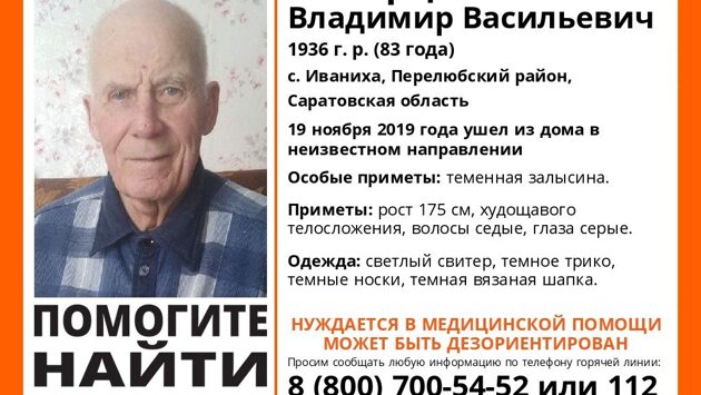В Перелюбвском районе в селе Иваниха без вести пропал пожилой человек. Как сообщают волонтеры поискового отряда «Лиза Алерт», 83-летний Самарцев Владимир Васильевич пропал 19 ноября. Также он может нуждается в медицинской помощи. — Рост пропавшего пенсионера около 175 см, телосложение худощавое, волосы седые, цвет глаз серый, на темени залысина. Последний раз он был одет в светлый свитер, темное трико, темные носки и темную вязаную шапку, — рассказали поисковики. Примечательно, что Владимир ушел из дома в неизвестном направлении без верхней одежды. Учитывая погодные условия отряды добровольцев прикладывают все усилия для поиска сельчанина. Всем, кому что-либо известно о его местонахождении, просьба сообщить по номеру телефона 8(905)385-02-65 (Люсьен) или 02 (с мобильного 102).