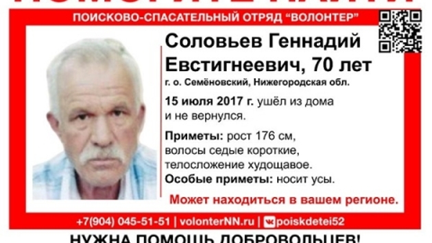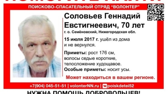 70-летнего Геннадия Соловьева ищут в Семеновском районе Нижегородской области. Об этом сообщает поисково-спасательный отряд «Волонтер». Напомним, пожилой мужчина ушел из дома 15 июля 2017 года и не вернулся. На вид пропавшему 65-70 лет. Его рост 176 см, худощавое телосложение, седые короткие волосы, усы. Отмечается, что возможно пенсионер потерял память. Любую информацию о Геннадии Соловьеве просьба сообщать в полицию по каналу связи 102 либо волонтерам по телефону 8 (831) 291-51-51. Ранее сообщалось, что 43-летнего Алексея Бубнова ищут в Арзамасском районе.