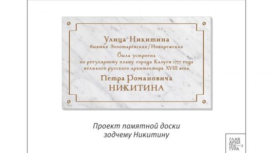 Главный архитектор Калуги Алексей Комов на своей странице в соцсети «ВКонтакте» 18 февраля опубликовал эскиз информационной памятной доски в честь Петра Никитина, создателя регулярного плана и архитектурного ансамбля центра Калуги. «Командная работа нас, увлечённых архитектурой и любовью к городу русских людей», — такой подписью он сопроводил эскиз. Доску шириной 850 и высотой 525 миллиметров планируется установить на фасаде дома № 3 на улице Никитина. Это здание больницы Красного Креста. Но улица названа в честь однофамильца архитектора — поэта-народника Ивана Никитина. Осенью прошлого года калужский краевед Юрий Юрьев предложил переименовать улицу поэта Никитина в улицу архитектора Никитина. "Финансов никаких в данном деле не предусматривается, но ежели найдутся доброхоты, которые захотят таблички памятные установить в разных частях улицы сей, то славы они городской имут немерено", - написал он в «Фейсбуке». Предложение установить памятную доску было услышано. В конце декабря на заседании городской комиссии по наименованию был одобрен и эскиз памятной доски, и место ее установки. Но перед принятием окончательного решения члены комиссии предложили заручиться поддержкой Алексея Комова и областного управления по охране объектов культурного наследия. Поддержку Комова идея получила, реакция управления по охране объектов культурного наследия нам пока не известна.