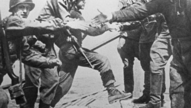 На ней старшие лейтенанты Уильям Робертсон из Техаса и Александр Сильвашко из Белоруссии. Плата за ужин Факт первый: фото постановочное. Репортажных нет просто потому, что сначала русские и американцы чуть не вступили в бой. 18 марта 1945 года американские истребители «Мустанг», сопровождавшие «летающие крепости» В-17, в районе Кюстрина по ошибке атаковали советские «Як-3» и сбили шесть из них. Двое пилотов погибли, не дожив до Победы всего ничего, от дружественного огня. Американцы также понесли потери, нарвавшись на самого Ивана Кожедуба в американской же «Аэрокобре». И когда войска союзников начали сходиться, в войска послали директиву: на участке встречи первым делом обустроить разграничительную линию, о наших планах и боевых задачах союзникам не сообщать, инициативу в организации дружеских встреч на себя не брать, к союзникам относиться приветливо. Никто этот приказ на местах не выполнил. В Торгау договорились опознавать друг друга по цветам ракет: наших по красной, американцев по зеленой. У будущего героя фотографии, лейтенанта Робертсона, ракет вообще не оказалось. Он, выбив дверь аптеки, намочил полотно марли зеленкой и вышел из положения. Факт второй: на этой фотографии должны были быть другие люди. На другом участке, 7-я рота 173-го полка 58-й Гвардейской дивизии во главе с гвардии лейтенантом Григорием Степановичем Голобородько (полтавским слесарем), встретившись с разведгруппой 69-й пехотной дивизии 1-й американской армии во главе с первым лейтенантом Альбертом Коцебу (техасский студент), вообще ничем друг другу не сигнализировали. Американец немедленно нарушил приказ генерала Ходжеса «не сближаться», отвязал лодку и поплыл к русским через Эльбу с криками «Russia! America!». Бойцы же 1-го Украинского фронта, никаких ракет не запустив, побежали знакомиться с союзниками и немедленно, в нарушение директивы маршала Конева, предложили выпить и закусить. Никаких фото при этом никто не сделал. Грубо нарушая приказ и субординацию, лейтенант Голобородько, взяв на себя функции командующего фронтом, предложил лейтенанту Коцебу организовать официальную встречу через час несколькими километрами ниже по течению, у деревни Крейниц. Но Коцебу опоздал, потому что немного погодя встретился с другой красноармейской частью, и застолье откладывать уже не стали. Это было правильно, но за вс` надо платить: героями поистине исторической фотографии стали другие лейтенанты — Уильям Робертсон и Александр Сильвашко. Рождение легенды Три часа спустя после встречи Коцебу и Голобородько, уже в самом Торгау воины 2-го батальона 173-го полка, той же 58-й дивизии заметили, что с колокольни городской церкви какой-то человек в незнакомой форме и каске размахивает куском белой, вымазанной зеленым материи и что-то кричит. Думая, что сдаётся немец, гвардии лейтенант Сильвашко стал кричать ему по-немецки, но тот не понял. Намечался бой, в ход пошли предупредительные выстрелы, когда до ушей красноармейцев донеслось «Moscow! America!». Это был лейтенант Робертсон с добытой в аптеке марлей, вымазанной зеленкой. «Я нарушил приказ не удаляться дальше 10 км от авангарда. Чуть не плакал от досады: у меня не было зеленой ракеты. Забежал в аптеку, покрасил бинт зеленкой и, размахивая этим, стал кричать: «America! Moscow! Comrade!», — признавался он. Еще одна деталь той встречи, о которой много лет н