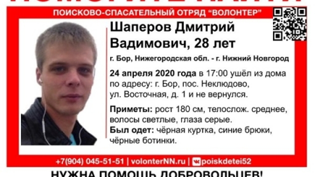 28-летнего Дмитрия Шаперова разыскивают в Нижегородской области. Об этом сообщает поисково-спасательный отряд «Волонтер». Молодой человек ушел из дома в борском поселке Неклюдово вечером 24 апреля и исчез. Согласно ориентировке, Дмитрий может находиться как на Бору, так и в Нижнем Новгороде. Приметы разыскиваемого: рост 180 см, среднего телосложения, светлые волосы, серые глаза. Выходя из дома на улице Восточной, он оделся в черную куртку, синие брюки и черные ботинки. Если вам известно, где может находиться Дмитрий Шаперов, просьба позвонить на горячую линию ПСО по номеру 8 (831) 291-51-51 или инфоргу поиска по телефону 89107932723 (Наталья). Напомним, с 29 апреля в Нижнем Новгороде ищут 62-летнего Владимира Старостина.