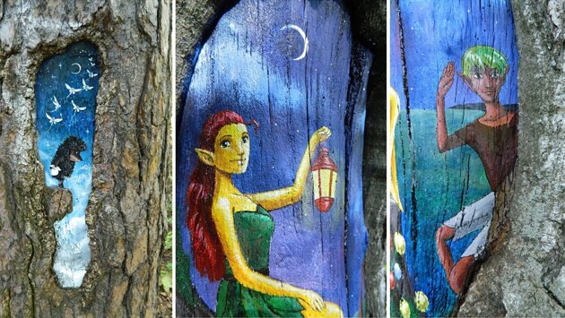 В Москве стартовала ежегодная акция по сохранению зеленых насаждений «ПаркАрт». Благодаря ей на деревьях появляются сказочные персонажи и красивые рисунки, которые радуют жителей. Впервые акция прошла в 2016 году, тогда в нем участвовали природно-исторический парк «Косинский» и Измайловский парк, лесопарки «Кусково» и Терлецкий. В этом сезоне акция охватит еще восемь зеленых территорий: к ней присоединятся парк «Кузьминки-Люблино», музей-заповедник «Царицыно», Москворецкий парк, природно-исторический парк «Тушинский», заказники «Алтуфьевский», «Лианозовский» и «Медведковский», а также усадьба Архангельское-Тюриково. О том, как зародилась акция «ПаркАрт» и как красивые рисунки помогают спасать деревья, mos.ru рассказали художники и экологи. Как природоохранная процедура превратилась в арт-проект У рисунков не только эстетическая функция — они помогают защитить пострадавшие деревья от гибели. Художники рисуют только на тех деревьях, на которых под воздействием внешних факторов образовались морозобоины — дупла или участки ствола без коры. Появлению новой картины предшествует большая работа. Ежегодно с наступлением весны в парках проводят инвентаризацию: специалисты осматривают деревья, ищут трещины от мороза, дупла и оголенные участки. Повреждения зачищают наждачной бумагой и дезинфицируют, покрывают «раны» водоотталкивающей грунтовкой — она не позволяет приникнуть внутрь спорам грибов, бактериям и паразитам. Получается защитный слой, который продлевает жизнь деревьям, не дает им гнить и разрушаться. На месте «раны» возникает белая ровная поверхность — настоящий холст, который так и просит, чтобы его разрисовали. Было лишь делом времени, чтобы на такую возможность обратили внимание художники. Начальник отдела экологического просвещения и учета животных дирекции природных территорий «Измайлово» и «Косинский» Юлия Нефедова вспоминает, как в 2016 году родилась акция «ПаркАрт». «Первым нашим художником стала Евгения Хлынина. Она подала нам идею для организации природоохранной акции. Художница предложила разрисовать белое полотно (пролеченное дерево) чем-нибудь приятным для глаз, чтобы люди проходили мимо и получали удовольствие. Евгения очень талантливая и создает бесподобные картины. Например, одна из первых ее работ — “Ежик в тумане”. Еще она рисовала эльфов», — рассказывает Юлия Нефедова. Чтобы люди смотрели и улыбались Художник-мультипликатор Евгения Хлынина поначалу не решалась рисовать на деревьях. Но однажды увидела в интернете статью про китайскую девушку, которая занималась этим. «В первый раз я пошла рисовать в парк без разрешения. К счастью, администрация смогла быстро найти меня через интернет. Мне разрешили рисовать и рассказали, как обрабатывать дерево перед покраской. Сначала нужно обработать морозобоину специальным защитным составом и только потом наносить рисунок. Так я и делала», — вспоминает художница. Одним из первых рисунков стал герой «Ежика в тумане». «Я художник-мультипликатор, и “Ежик в тумане” — один из моих любимых мультфильмов. Я выбрала этого героя для своего первого рисунка, потому что его все знают, он всем нравится. Я решила, что для наших людей Ежик родной, знакомый с детства. Боялась, что рисунок будут портить какие-нибудь нехорошие люди, и подумала, что на Ежика у них рука 