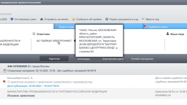 Арбитраж Москвы 20 октября 2020 года планирует приступить к рассмотрению иска Министерства промышленности и торговли России к крупному разработчику интегральных микросхем и систем для использования в энергоэффективных компьютерных и промышленных системах. С АО «Байкал Электроникс» требуют более 0,5 млрд рублей, передаёт ИА REGNUM. Иск поступил в суд 18 августа, 24 августа его приняла в работу судья Большебратская. Сумма требования — 500 499 802 рубля 24 копейки. Подробности спора неизвестны. На сайте компании-ответчика уточняется, что «процессоры Baikal производятся на фабрике компании TSMC — крупнейшего в мире производителя микроэлектронных компонентов». Компьютеры на базе процессора «Байкал-Т1» используются и в подразделениях МВД РФ. Фирма была поставщиком по пяти госконтрактам на 12,8 млн рублей. АО учреждено в Московской области в январе 2012 года. Уставный капитал — более 7,6 млн рублей. Учредителем выступает Всеволод Опанасенко — основатель «Т-Платформы», который проходит фигурантом уголовного дела по подстрекательству к злоупотреблению должностными полномочиями. В основе дела — госконтракт на сумму более 350 млн рублей.