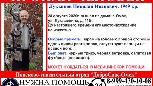Сегодня, 28 августа, на омском Левобережье пропал 71-летний Лукьянов Николай Иванович. Пенсионер вышел из дома №11Б по улице Лукашевича в первой половине дня, с тех пор о нем ничего неизвестно. Об этом сообщили представители поисково-спасательного отряда «Доброспас-Омск». Волонтеры также отметили, что пропавший дедушка может нуждаться в медицинской помощи. Особые приметы: шрам на голове с правой стороны вдоль линии роста волос, отсутствуют пальцы на правой ноге. Был одет: черное трико, черная ветровка, салатовая футболка (возможно). Если вам что-либо известно о местонахождении Николая Ивановича, просьба сообщить об этом в полицию или по телефону, указанному в ориентировке.