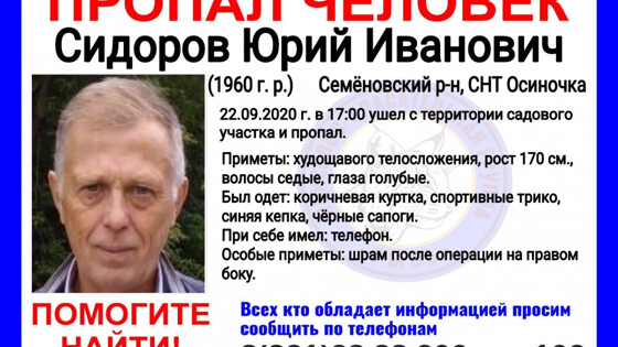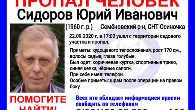 Мужчину ищут родственники и волонтеры. Юрий Сидоров пропал без вести в СНТ «Осиночка» Семеновского района 22 сентября, сообщается на сайте ПСЦ «Рысь». В последний раз его видели уходящим с территории садового участка около пяти часов вечера. Приметы пропавшего: рост 170 сантиметров, телосложение худощавое, глаза голубые, волосы седые. На мужчине была коричневая куртка, спортивное трико и синяя кепка и черные сапоги. При себе он имел телефон. Особые приметы: шрам после операции на правом боку.