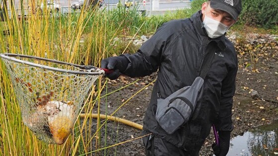 Во вторник, 13 октября, сотрудники Мосводостока выловили рыбок из прудов парка «Зарядье». Теплолюбивые карпы кои, цветные караси и кометы переждут холодное время года в закрытых бассейнах. Декоративные рыбки обитают в трех из четырех прудов «Зарядья». Перед тем как их выловить, рабочие Мосводостока откачивают воду, понижая ее уровень настолько, насколько это возможно. Так рыбу будет проще поймать сачком. — Наши караси и карпы отличаются яркой окраской, поэтому их хорошо видно через толщу воды, — говорит гидробиолог Ольга Миронова. — Считается, что такие золотые рыбки приносят счастье. Живые талисманы — всего около 200 особей — поселились в прудах «Зарядья» весной. За лето они подросли и даже вывели потомство. Мальки от трех до четырех сантиметров в длину резвятся и играют среди взрослых рыб, сбившихся в стайки. — Значит, рыбе здесь комфортно, — отмечает Миронова. На водоемах специально высажены растения, которые не просто украшают, а очищают пруды. Среди них, например, ряска. Плавающее на поверхности растение поглощает растворенный в воде углекислый газ, выделяя кислород. — Кстати, раньше ряску слегка проваривали, смешивали со сливочным маслом и наносили на бутерброды, — поделилась интересным фактом гидробиолог. На прудах также растут рогоз, вечнозеленый аир, лекарственная вахта трехлистная и нимфеи — кувшинки, цветущие до самых заморозков. — По нимфеям можно определять время, — рассказала Ольга Миронова. — Утром они обычно распускаются около восьми часов, а закрываются примерно в четыре вечера. Рыбы живут в прудах до тех пор, пока температура воды для них допустима. А это не ниже пяти градусов тепла. Все это время за рыбами присматривают специалисты и через день дают им прикорм — для здоровья и яркого окраса. ПРЯМАЯ РЕЧЬ Дмитрий Рябцев, главный инженер эксплуатационного гидротехнического района № 1 ГУП «Мосводосток»: — Водоемы «Зарядья» — самые мелкие пруды в Москве. Их глубина составляет от 30 до 60 сантиметров. Улучшить состояние прудов помогают уникальные технологии. Например, ультразвуковые датчики, предупреждающие образование илового осадка. Читайте также: Почти 100 килограммов корма собрали москвичи для Дзюбы и Месси в рамках акции