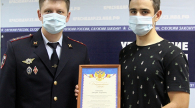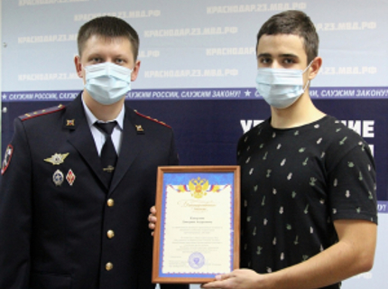На Кубани за содействие в пресечении противоправных действий благодарственным письмом полиции награжден юный житель Краснодара