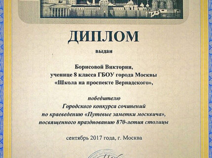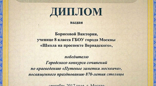 Школьница из Тропарево-Никулино победила на городском конкурсе сочинений по краеведению
