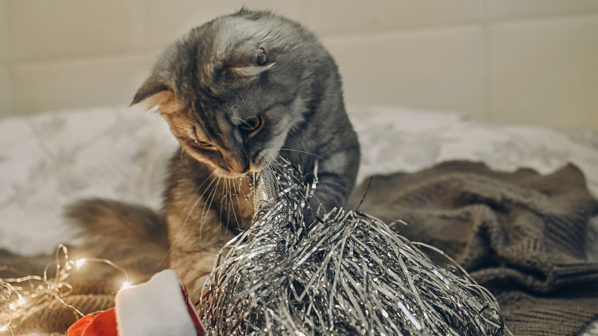 Мишура, «дождик», гирлянды, маленькие ёлочные игрушки и блестящие украшения невероятно привлекательны для кошек и щенков, при этом они вызывают серьёзные повреждения кишечника вплоть до его разрыва. Осколки разбитых шаров могут поранить лапы и слизистую рта, а провода от гирлянд — стать причиной удара током.