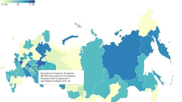 По проценту пропущенных голосований в рамках осенней сессии (ноябрь-декабрь) Госдумы в 2020 году республика заняла 41 место. Депутаты от РТ пропустили 28,75% голосований.