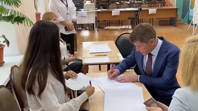 Согласно сообщению, традиционно глава Приморья отдаёт свой голос на избирательном участке на Океанском проспекте в Приморском колледже технологии и сервиса. После голосования Олег Кожемяко отметил, что трехдневный процесс волеизъявления является удобным для избирателей.