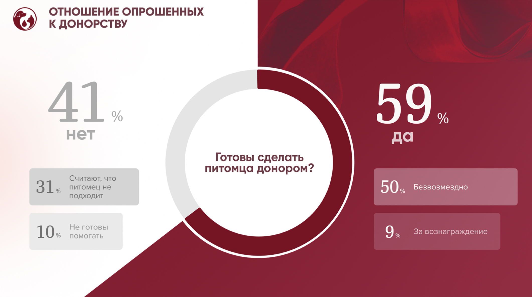 Интерес к донорству при этом высокий: 59% участников опроса сообщили, что готовы предлагать своего питомца в качестве донора: среди тех, кто согласен, половина готова делать это безвозмездно, ещё 9% — за вознаграждение. В качестве поощрения владельцы чаще выбирают не деньги, а практичную поддержку: бесплатные обследования, приоритетный поиск крови для своего животного в случае необходимости, препараты и корма, бонусы на услуги клиник.