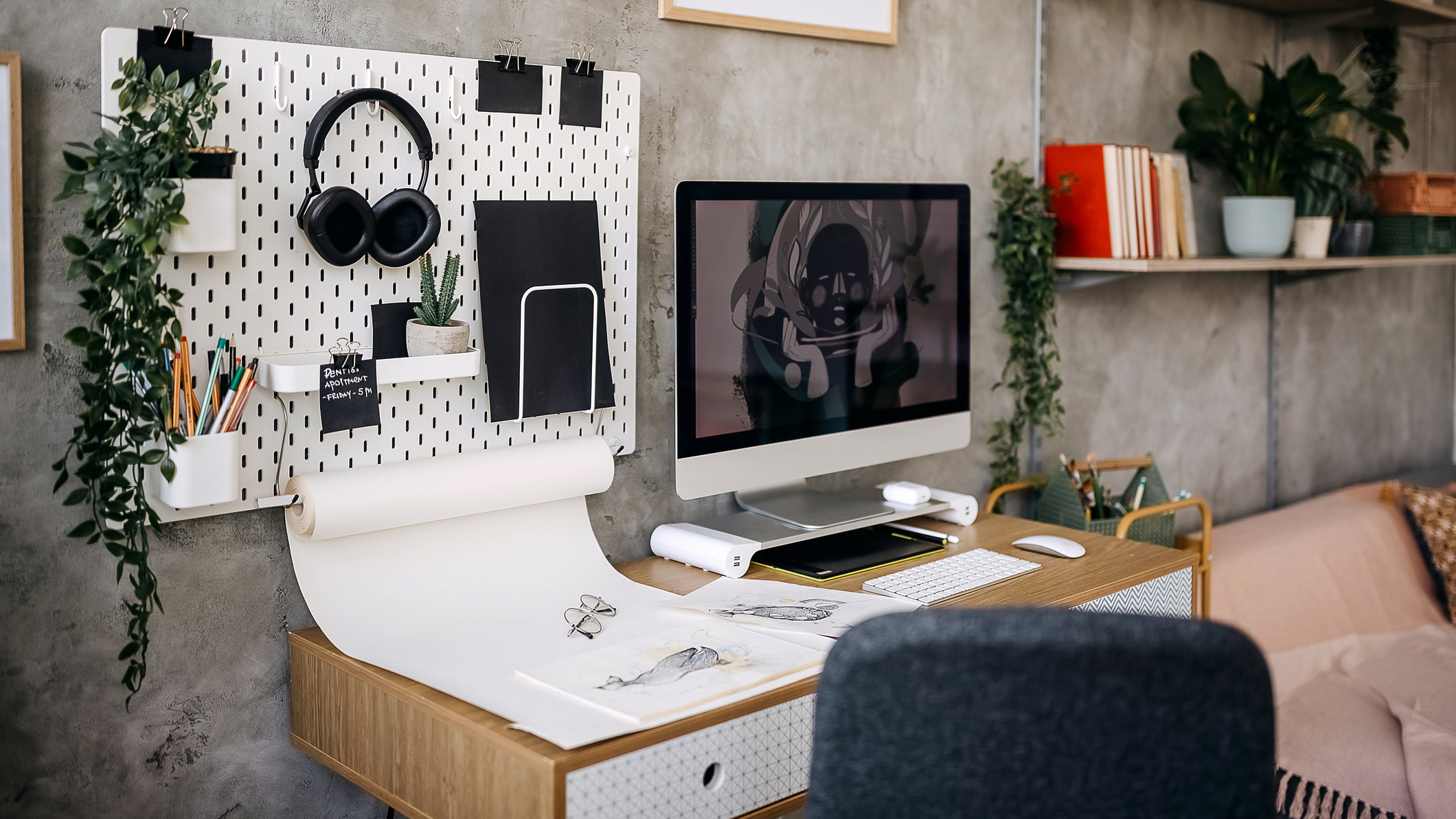 В выборе отталкивайтесь от интересов и вида работы мужчины. Любителю гаджетов пригодится док-станция для гаджетов с возможностью беспроводной зарядки или толковый органайзер для проводов. Тем, кто пишет от руки, подойдёт стильный органайзер для канцелярии или удобные лотки для бумаг, чтобы на столе всегда был порядок. Творческим личностям пригодится пегборд, чтобы можно было легко адаптировать систему хранения под себя и полностью освободить стол.