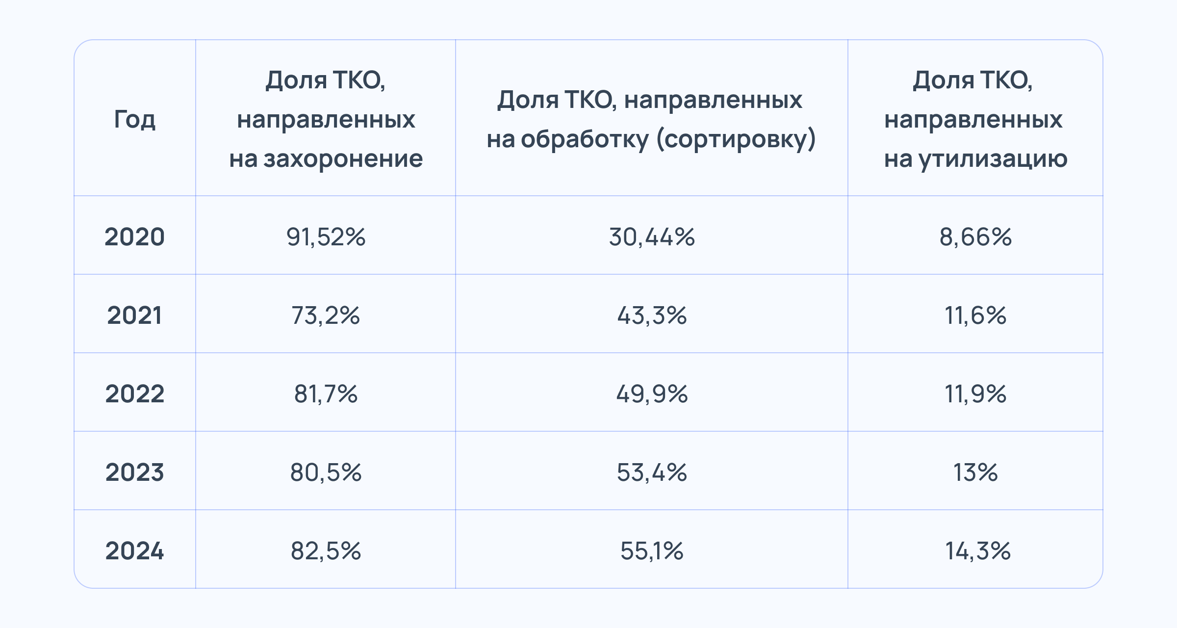 Кроме того, в 2019 году в России по указу президента появилась публично-правовая компания по формированию комплексной системы обращения с ТКО «Российский экологический оператор» (РЭО). Именно РЭО предоставляет годовые отчёты по этим показателям, по которым можно проследить динамику.