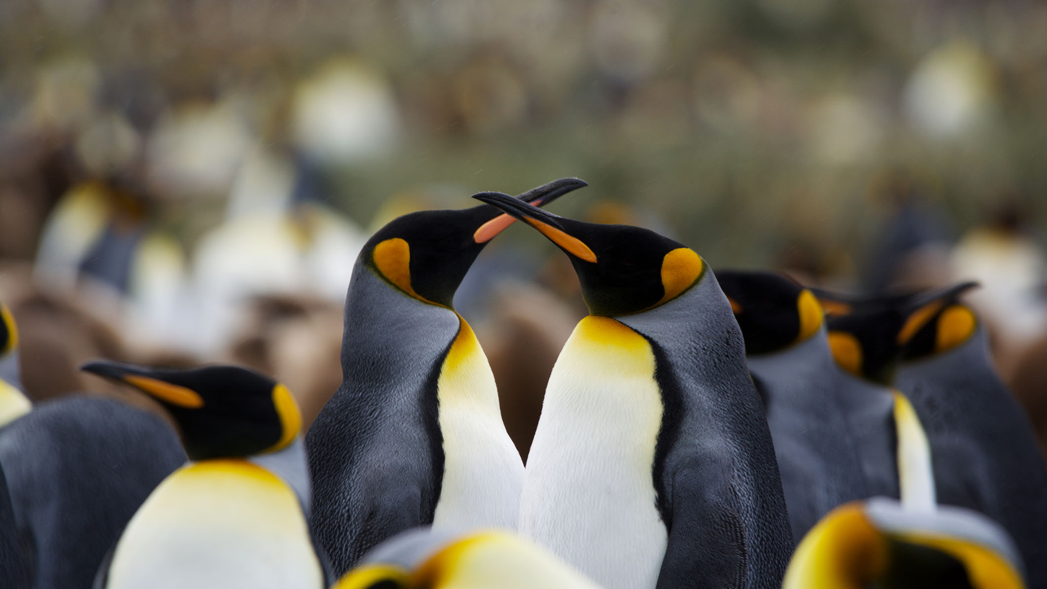 Императорские пингвины встречают любовь в самое суровое время года — во время антарктической зимы. В апреле они преодолевают 50–150 км по ледяному ландшафту к местам гнездования. Самцы прибывают первыми, тщательно приводят перья в порядок и подают голос: каждый поёт уникальную песню, по которой самка выбирает его среди тысяч других. Так пара соединяется на весь сезон.