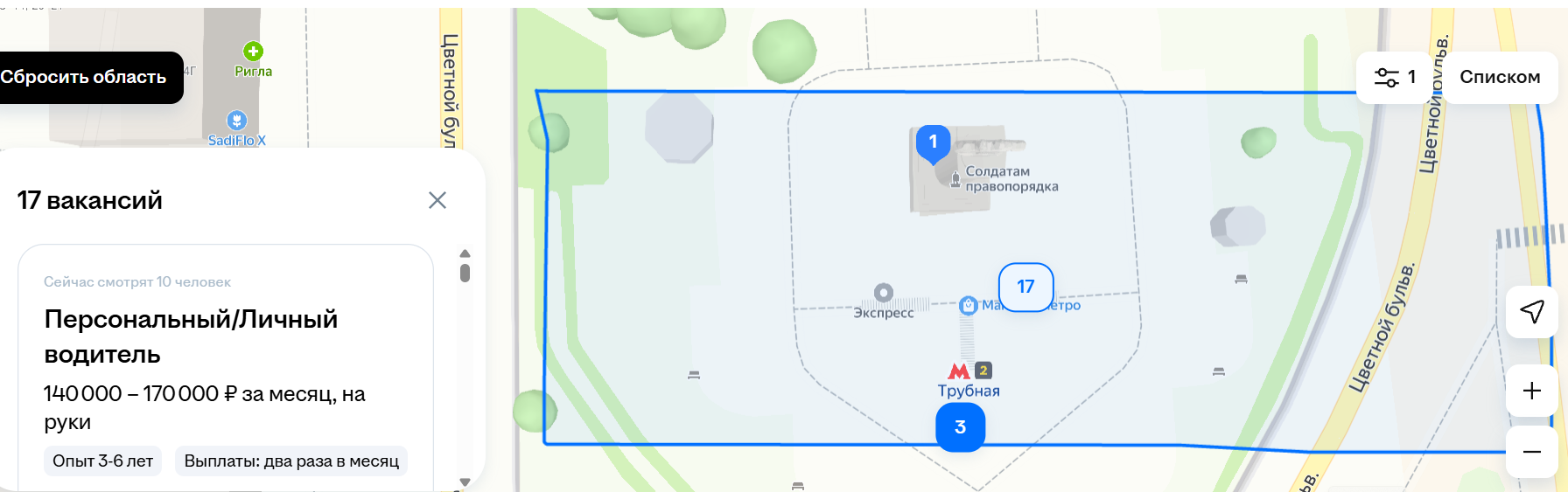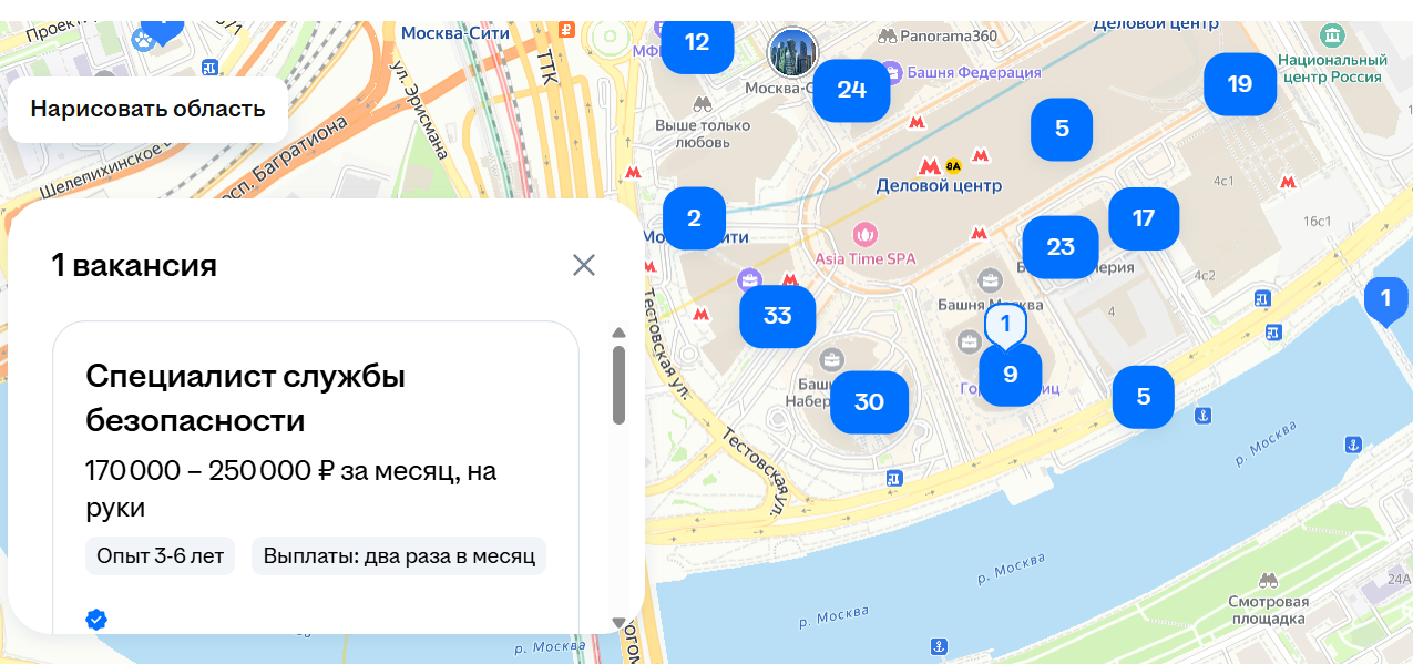 Также можно самостоятельно нарисовать область поиска на карте. Например, если вы ищете вакансии рядом с домом, который находится возле конкретной станции метро.