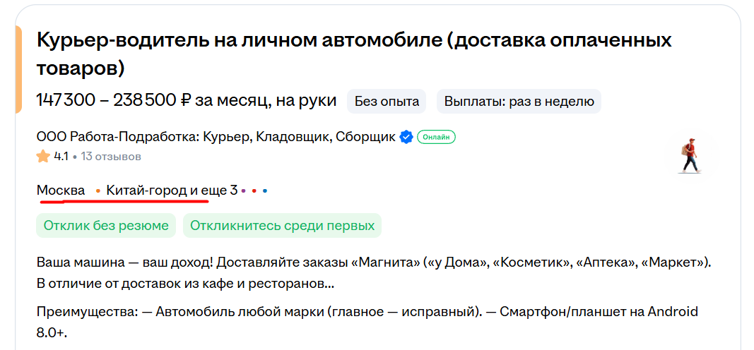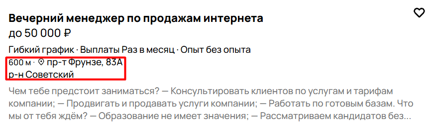 Поиск выдаёт описание вакансий с указанием точного адреса и расстояния до работы.