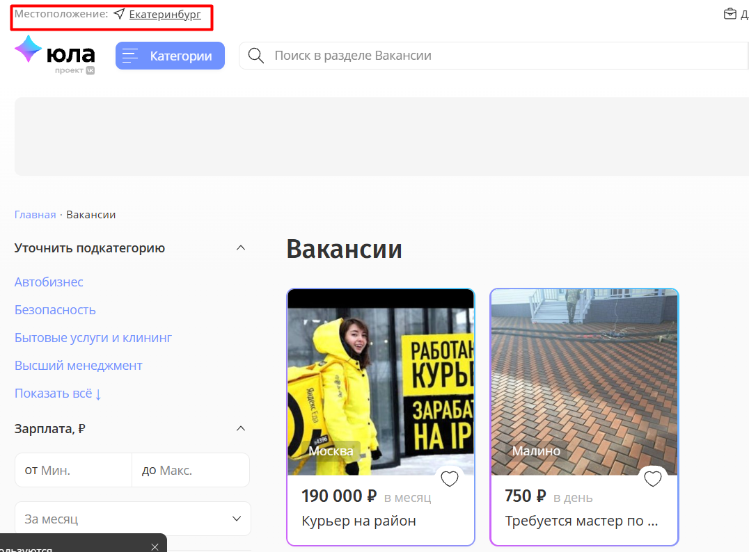 На «Юле» возможности поиска более ограниченны. На главной странице можно выбрать только местоположение, например Екатеринбург, и получить список вакансий. Внутри объявления есть адреса работодателей. Однако в вакансиях для Екатеринбурга встречаются предложения и из других городов.