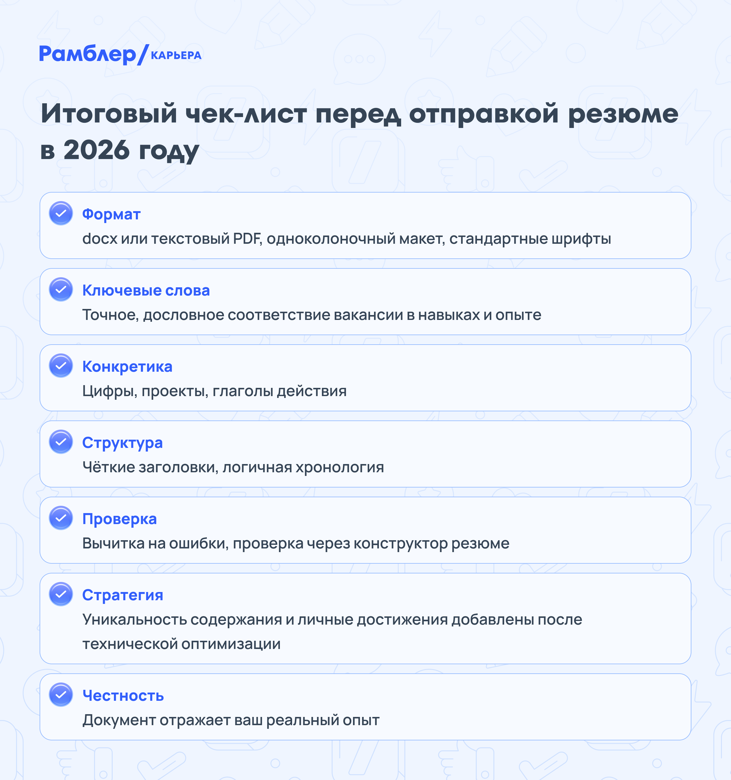 Убедитесь, что ваше резюме соответствует всем пунктам, перечисленным ниже, — от технических до стратегических.