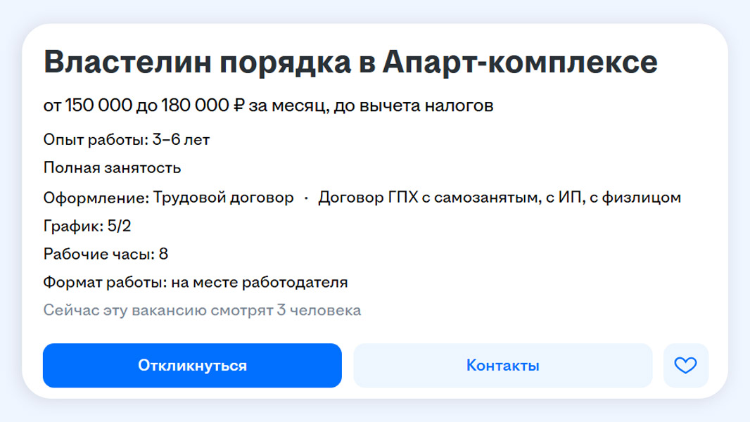 В московском апарт-комплексе ждут сотрудника, который станет заботливым родителем для жителей многоквартирника. За такие супернавыки работнику готовы платить 150–180 тысяч рублей.