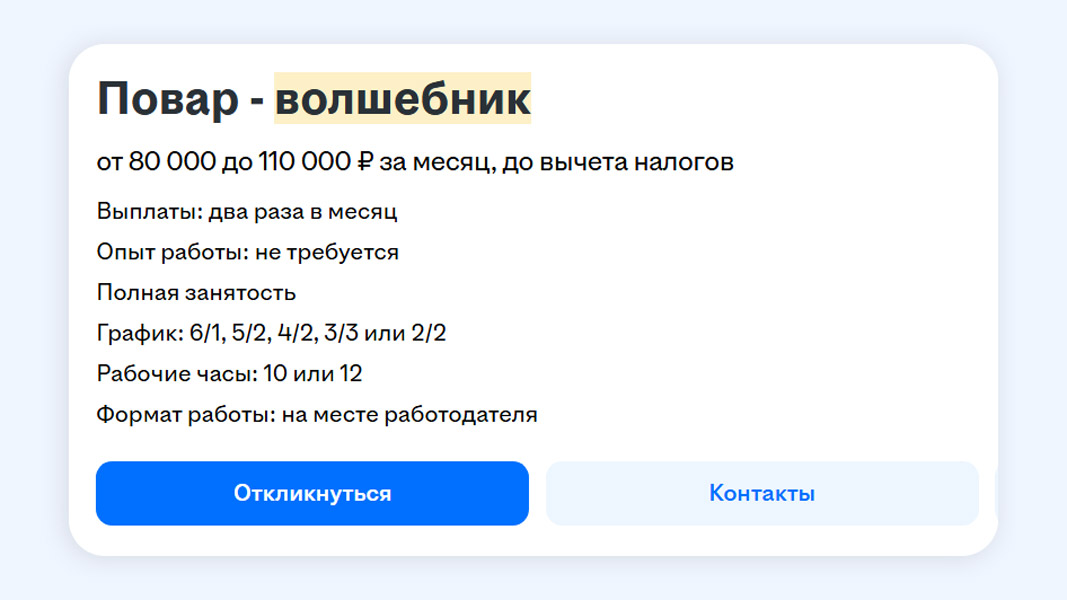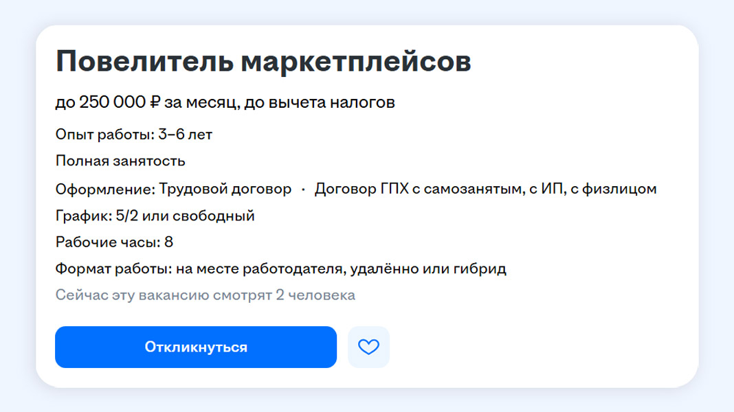 «Если для тебя Wildberries, OZON, "Яндекс Маркет" — не просто сайты, а игровые поля, где ты выстраиваешь победные стратегии… Если ты видишь в карточке товара не просто описание, а "ловушку для внимания" покупателя... Если рост ключевых метрик тебя радует больше, чем утренний кофе, тогда ты наш человек, а точнее — наш будущий Повелитель Маркетплейсов», — так работодатель видит будущего сотрудника.