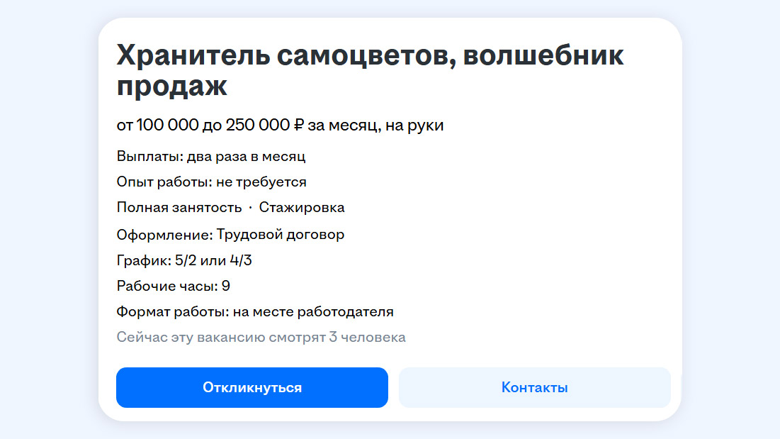 Хранителю самоцветов готовы платить от 100 до 250 тысяч рублей, а также отправлять на бесплатные тренинги и курсы, давать корпоративные скидки на украшения. Соискателю обещают официальное трудоустройство и карьерный рост в стабильной компании.