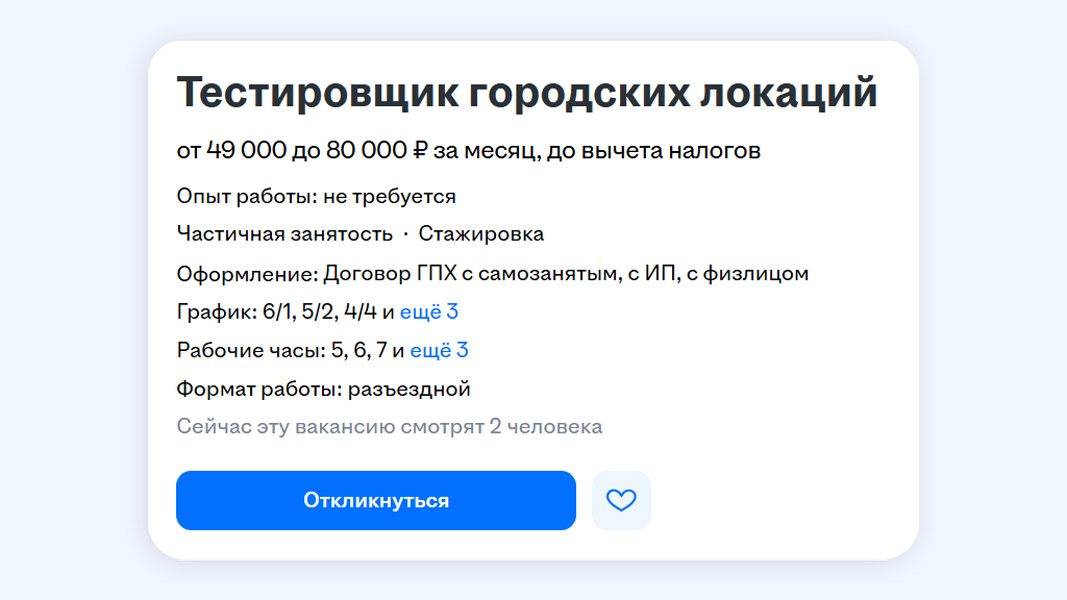 Работодатель обещает, что тестировать городские локации можно в любое время с 10:00 до 18:00, а всего работать придётся от 25 часов в неделю. Никаких особых навыков и знаний не нужно, достаточно любить гулять и открывать новые места. При этом за проверку мест готовы выплачивать от 50 до 80 тысяч рублей до вычета налогов, а самое главное — отсутствие начальника и душного офиса.