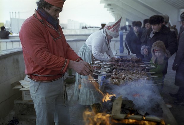 Продажа шашлыков на празднике «Проводы русской зимы» в Люблинском парке культуры и отдыха имени Ленинского комсомола в Москве, 26 февраля 1983 года