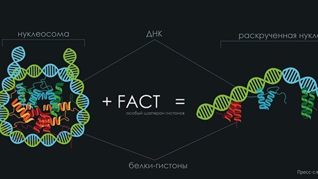 Российские ученые и их американские коллеги выяснили, как работает белок FACT, "распаковывающий" свернутую ДНК клеток без затрат энергии, что поспособствует созданию новых лекарств от рака и раскрытию секретов зарождения жизни на Земле, говорится в статье, опубликованной в журнале Nature Structural & Molecular Biology. Общая длина всех молекул ДНК, входящих в состав хромосом человека, составляет около двух метров, поэтому нашим клеткам приходится "сжимать" их нити примерно в 10 тысяч раз для того, чтобы они могли поместиться в ядре. Для этого, к примеру, клетка "наматывает" ДНК на особые белковые "катушки"-нуклеосомы, так называемые белки-гистоны, которые удерживают ее нити на месте и к тому же влияют на их активность. Когда клетка хочет считать какой-то ген, ей приходится частично "разматывать" эти генетические катушки. То же самое происходит при делении, когда клетке нужно создать копию своей ДНК и передать ее одной из дочерних клеток. Это очень сложный процесс, в котором ключевую роль играет специальный белок FACT, одновременно помогающий ДНК распутаться и запутаться. То, как он работает и как много энергии он тратит на эту операцию, ученые не знали. Ксения Кудряшова, сотрудник Института биоорганической химии РАН и МГУ имени Ломоносова, и ее коллеги по институту и ученые из США, выяснили, как работает FACT и показали, что он почти не тратит на это энергии, наблюдая за работой данного белка при помощи новой методики микроскопии, созданной в России. Как рассказывает Кудряшова, данная методика, так называемая spFRET-микроскопия, позволяет следить за работой и структурой одиночных молекул благодаря добавлению в них "хвостов", которые светятся, если подсветить их лазерным лучом определенного цвета. Яркость свечения каждого такого "хвоста" зависит от того, где он расположен, что позволяет следить за изменениями в структуре молекул ДНК и белков во время "разматывания" катушек генетического кода. Используя данную методику, ученым впервые удалось увидеть, как FACT раскручивает нуклеосомы, при этом не тратя на это энергии, что стало неожиданностью для самих биологов, так как другие ферменты, взаимодействующие с ДНК, обычно тратят на этот процесс много АТФ, клеточной "энерговалюты". Оказалось, что самого факта соединения FACT с "катушками" ДНК было достаточно для того, чтобы нити генетического кода распрямились сами по себе и при этом не оторвались от гистонов. Благодаря этому клетка получает возможность "считать" выпрямленную ДНК и после этого ей не приходится заново наматывать ее на белковую "катушку". Изучение этого процесса, как считают ученые, поможет нам понять, как происходит подобный процесс в раковых клетках, чьи гены отличаются повышенным уровнем активности, и понять, как работу FACT в них можно подавить. Кроме того, дальнейшее изучение работы FACT поможет ученым выяснить, как возник этот белок и какую роль он играет в размножении "здоровых" клеток во время роста зародыша или в детском организме.