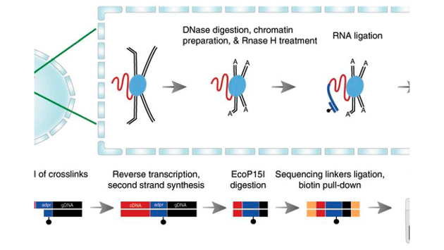 Международная группа ученых, в которую входит представитель ФИЦ биотехнологии РАН, ИОГЕН и МФТИ, разработала новый, более надежный метод для изучения контактов РНК с ДНК в ядре клеток. Метод поможет определить роль РНК в регуляции работы генов, что в будущем может быть важно, например, для лечения различных заболеваний Статья об исследовании опубликована в Nature Communication. Работа была поддержана Российским научным фондом (РНФ). Функция большинства некодирующих РНК до сих пор неочевидна. В разных типах клеток должны работать разные гены и синтезироваться разные белки: в клетке мозга — одни, в клетке крови — другие. Это значит, что существуют факторы, которые влияют на активность генов. Известно, что длинные некодирующие РНК взаимодействуют с хроматином — веществом, которое представляет собой молекулу ДНК, плотно упакованную с помощью белков. Хроматин может менять свою структуру: разворачиваться и сворачиваться, открывая гены для считывания или, наоборот, закрывая их. Если некодирующие РНК связываются с определенными участками хроматина, они могут влиять на его структуру и таким образом регулировать активность этих участков. Чтобы понимать, как регулируется активность генов и как это влияет на специализацию клетки, необходимо знать, какие некодирующие РНК с какими участками связываются. Есть несколько методов, которые позволяют определять места, где взаимодействуют РНК и хроматин. Однако из-за ряда ограничений они пропускают много взаимодействий, к тому же некоторые из них требуют для анализа большого количества материала или разрушения клетки. Авторы работы разработали новый метод, который не разрушает клетку до закрепления контактов РНК и хроматина и показывает более высокую точность, — они назвали его RADICL-seq. В ядре клетки большинство РНК связаны с хроматином: РНК закрепляется в белках, которые связывают ДНК. Метод RADICL-seq заключается в следующем. В ядро добавляется фермент, который делает разрывы на ДНК и оставляет свободные концы, пригодные к сшивке. Также добавляется фермент, который разрушает свободные РНК и тем самым повышает точность определения контактов. Потом добавляют молекулу, у которой один конец — одноцепочечный и связывается с РНК, а второй — двухцепочечный и связывается с расположенной рядом ДНК. Таким образом, эта молекула служит мостиком, скрепляющим РНК и ДНК. Дальше удаляют белки, достраивают вторую цепочку и получившийся ДНК-комплекс готовят к секвенированию, где определяют последовательности связанных РНК и ДНК. Ученые проверили метод RADICL-seq в действии. По сравнению с другими методами, он показал более высокую точность определения хроматин-РНК-взаимодействий. Благодаря высокому разрешению метода авторам удалось найти новые контакты не только некодирующих, но и кодирующих РНК с хроматином, включая те, которые расположены вдали от мест, где данная РНК считывается. Также они показали на клетках мыши, что метод подходит для изучения специфики взаимодействий в разных типах клеток. Они взяли две некодирующие РНК (одна из них, возможно, связана с шизофренией) и построили карту их взаимодействий с геномом в двух типах клеток: эмбриональных стволовых и предшественников олигодендроцитов (нейроглиальных клеток). Карты получились характерными для данных типов клеток и РНК. Исследование подтвердило важ