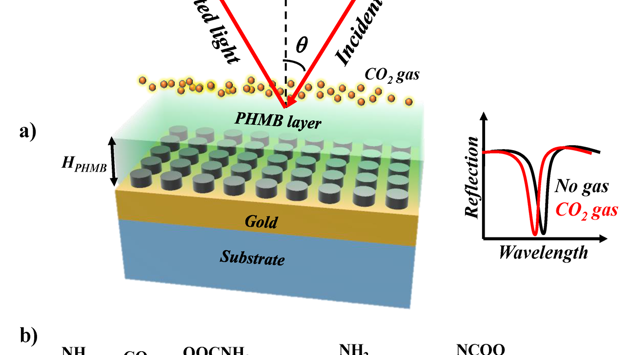 Механизм работы заключается в измерении длины волны отраженного света, который улавливается с помощью фотодетектора, а он используется для преобразования фотонов в ток. Когда газ CO2 попадает в камеру, он поглощается слоем полигексаметилен бигуанидина. После этого показатель преломления слоя уменьшается, а свет отражается под углом 45 градусов. Изменение показателя преломления слоя полигексаметилена, а также сдвиг длины волны отраженного света относительно исходного зависят от концентрации газа. Преимущество предлагаемого датчика заключается в том, что он не вызывает нежелательного изменения показателя преломления в слое полимера и не фиксирует уровень содержания других газов в воздухе, например азота и водорода. Кроме того, можно настраивать электромагнитные характеристики материала и получать определенные оптические свойства, например, изменить уровень поглощения света и таким образом обнаружить большие концентрации углекислого газа.