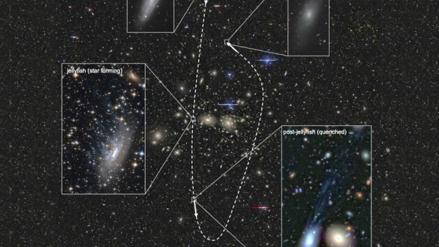 Исследователи обнаружили у изученных объектов специфические хвосты из разреженного газа и недавно сформировавшихся звёзд. По словам учёных, хвосты были сформированы под воздействием межгалактического газа, который присутствует во всех скоплениях галактик и представляет собой плазму температурой до десятков миллионов градусов. Когда маломассивные галактики взаимодействовали с нагретой плазмой, она «выдавила» их собственный газ, который потом образовал эти структуры.