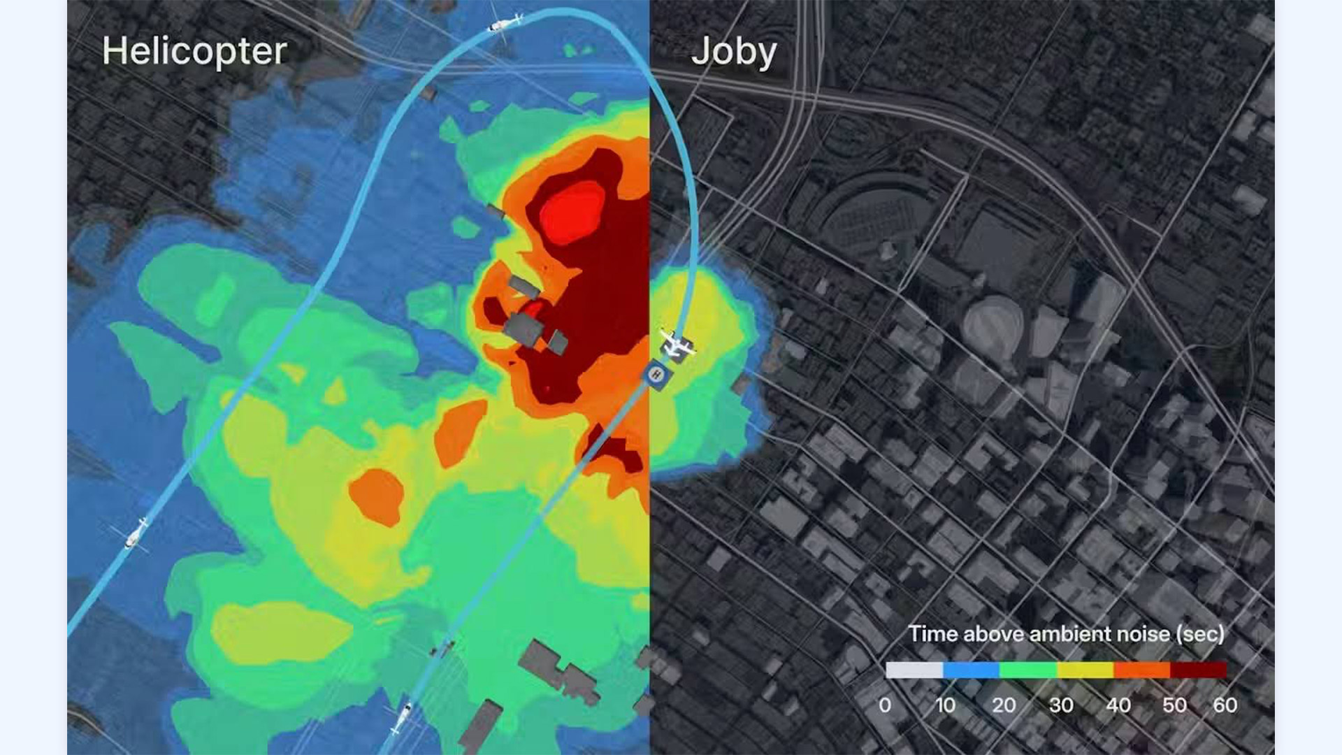 Сравнение контуров шума от вертолёта (слева) и eVTOL от компании Joby Aviation