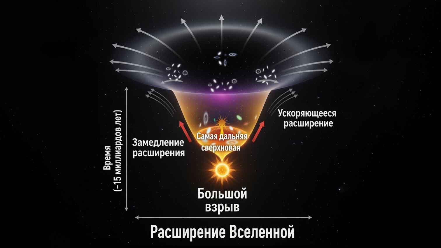 Причиной ускорения признали тёмную энергию. Она обладает парадоксальным свойством — отрицательным давлением, которое вызывает гравитационное отталкивание. Тёмная энергия не расталкивает галактики физически, она изменяет саму геометрию пространства, заставляя его растягиваться быстрее, чем гравитация может стянуть материю обратно.