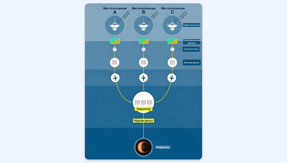 Радиоволны из космоса достигают разных телескопов не одновременно. Чтобы соединить их в одно целое, сигнал на каждой станции нужно отметить сверхточным временем. Для этого используют водородные мазеры — атомные часы с исключительной стабильностью. Они обеспечивают точность выше четырёх пикосекунд. Это позволяет свести воедино данные с антенн, которые разделены тысячами километров.