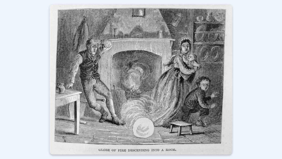 Шаровая молния залетела в дом через дымоход, гравюра 1886 года