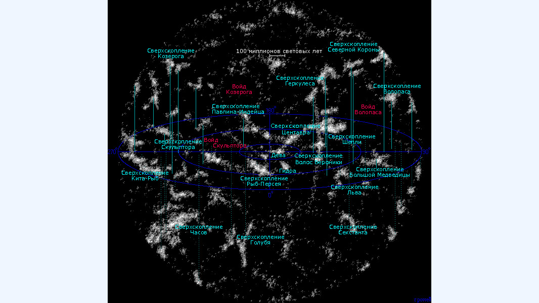 Карта сверхскоплений и пустот во Вселенной в пределах 1 миллиарда световых лет. В центре карты — Местное сверхскопление галактик, в котором расположен Млечный Путь.