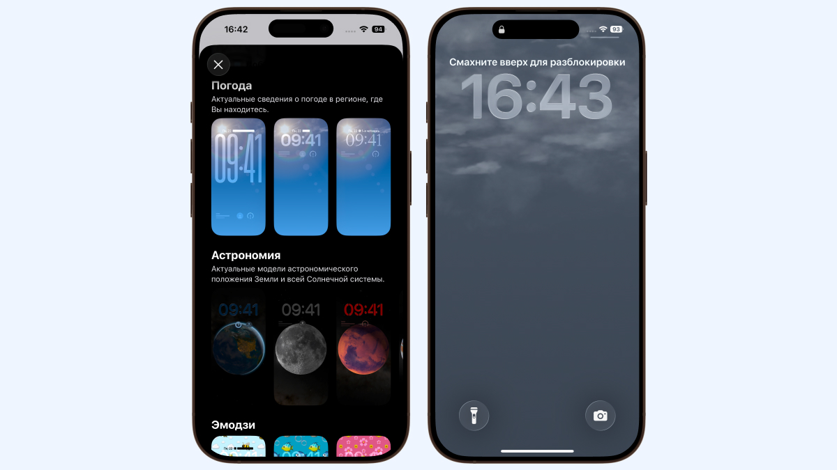 Второе: добавились несколько новых видов обоев, связанных с погодой. Они так же отображают текущие условия для вашего местоположения: например, если вы живёте в Москве и на улице идёт ливень, по экрану блокировки будут стекать виртуальные капли дождя.