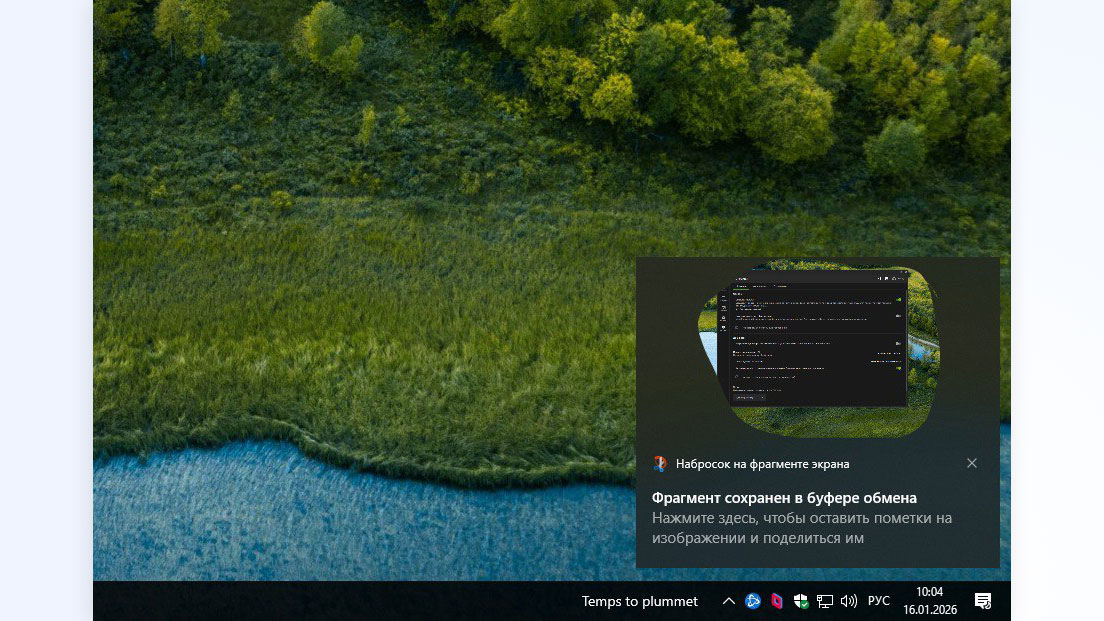 Дальше алгоритм действий зависит от того, какой тип скриншота вам нужен. По умолчанию выбран прямоугольный фрагмент: чтобы сделать снимок экрана в таком формате, просто зажмите левую кнопку мыши и тяните курсор, пока не выделите нужную часть экрана. После этого отпустите кнопку — картинка сохранится в буфере обмена, и вы сразу увидите уведомление об этом в правом нижнем углу экрана.