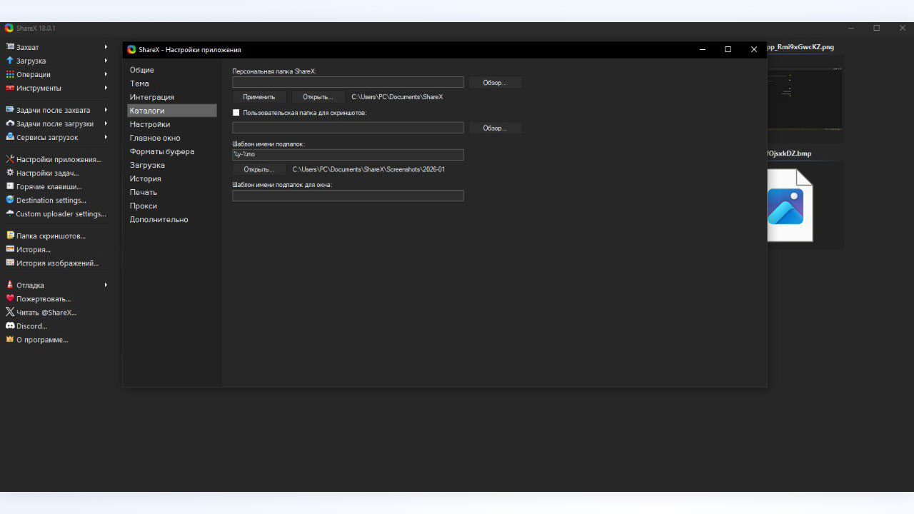 Если хотите изменить стандартную папку для сохранения скриншотов, в том же левом меню откройте «Настройки приложения» и перейдите в раздел «Каталоги». Поставьте галочку напротив «Пользовательская папка для скриншотов» и выберите нужную на вашем ПК.