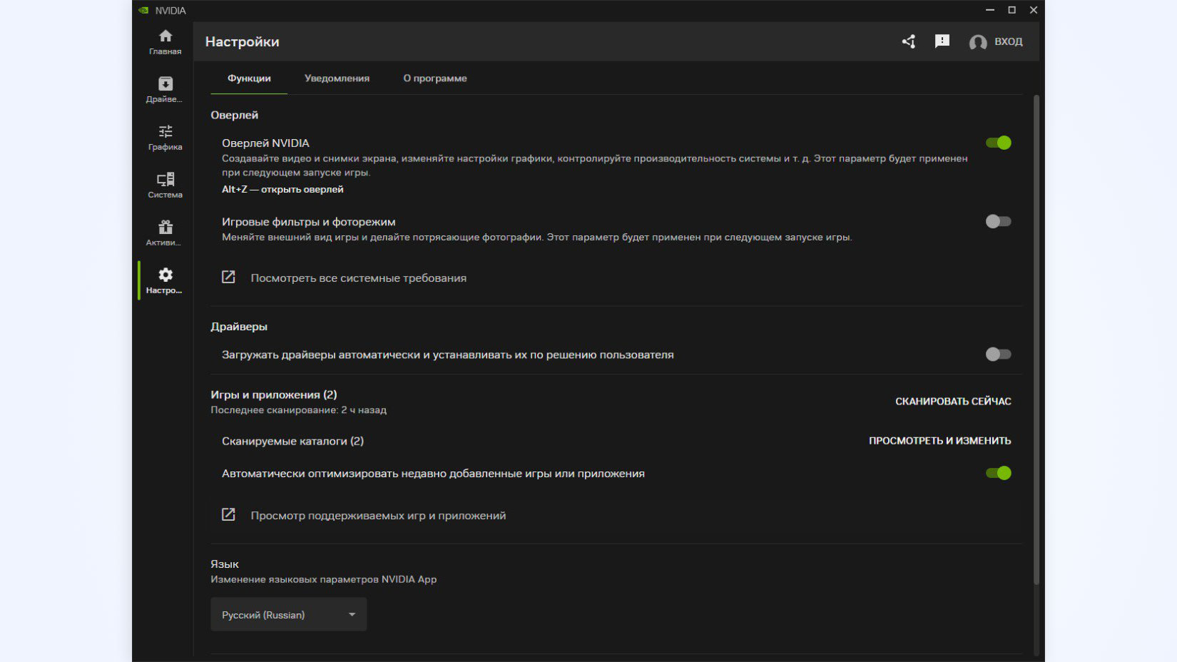 - В левом вертикальном меню выберите «Настройки», а во вкладке «Функции» включите «Оверлей NVIDIA» — переведите ползунок в активное положение. Теперь вы сможете вызывать меню драйвера поверх любой игры или работающей программы. Для этого зажмите клавиши Alt + Z. А если хотите сразу сделать скриншот, зажмите Alt + F1. Картинка сохранится на вашем компьютере в папке «Видео» → NVIDIA.